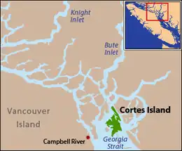 Cortes Island is an island in the Discovery Islands archipelago on the coast of British Columbia, Canada. The island is 25 km (16 mi) long, 13 km (8 mi) wide, and 130 km2 (50 sq mi) in area. It has a population of 1,035 permanent residents (2016 census).[1] Cortes Island lies within Electoral Area B of the Strathcona Regional District,[2] which provides water and sewerage systems, fire protection, land use planning, parks, recreation, and emergency response.[3]