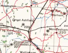 "a parish in Hartismere district, Suffolk; on the Eastern Union railway, 1½ mile S of Finningham r. station, and 6 N by E of Stowmarket. The church is good; and there is a Wesleyan chapel, a parochial school, and charities."[5]