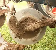Its earliest design consisted of a knife-like blade.[3][1] In 2011 an early medieval coulter was excavated from a site in Kent, England.[4][5] Coulters using a flat rotating disc began being used c. 1900.[6][1] Its advantage was a smoothly cut bank, and it sliced plant debris to the width of the furrow.[2]