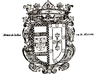 The universal heir of Gomes Soares de Melo and his wife D. Filipa de Castro was their only child, D. Margarida Soares de Alvarenga, Lady-in-Waiting to Queen Maria, who also inherited her uncle's morgadio.[10] She married the Castillian nobleman D. Juan de Alarcón, son of the Lords of Valverde, who had come to Portugal in 1500 with his mother, D. Elvira de Mendoza, who was First Lady of the Bedchamber to Queen Maria, Infanta of Spain, on her marriage to King Manuel I of Portugal.[12][13]