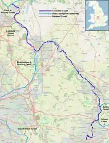 It starts in Coventry and ends 38 miles (61 km) to the north at Fradley Junction, just north of Lichfield, where it joins the Trent and Mersey Canal.[1] It also has connections with the Ashby Canal, the Birmingham and Fazeley Canal and the Oxford Canal.