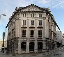 In 1878, the Crédit Communal established its head office at the corner of rue de Ligne and rue de la Banque in central Brussels, next to the then newly finished building of the National Bank of Belgium. That building was eventually demolished and replaced in the 1970s by a complex designed by prominent architect Marcel Lambrichs, presenting a neoclassical stone-faced front towards the National Bank and modern curtain-wall façades on the other sides.[4][5]