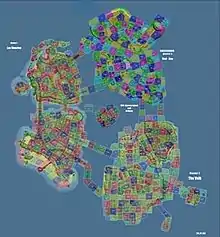 Pacific City within the game consists of 495 "city blocks" which the player could travel among, according to Microsoft Game Studios' Jami Johns.[14][15] Each block had to be tested separately, so Microsoft Game Studios designed a software tool to track issues when the game was in testing.[14] For example, the tool was able to identify blocks where the performance dropped or the game crashed, allowing the developers to redesign the area to remove the issues. A further tool was used for the "seams" between city blocks, and included a screenshot just prior to any problem, which significantly reduced the debugging time for the game; this tool was further used with Forza Motorsport 2.[14] However, the team had found some bugs during testing that actually worked well as game mechanics without throwing off the game balance. For example, the ability to drive the Agency SUV up a vertical wall when the player has maxed out his driving skill was originally a bug within the game.[14]