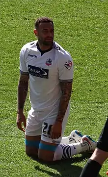 In January 2013, Bolton Wanderers made a successful £300,000 transfer bid for Davies, and began negotiating personal terms.[46][47] He agreed to a two-and-a-half-year deal, and became Dougie Freedman's first permanent signing as the "Trotters" manager.[48] He made his debut for Bolton on 19 January, as a late substitute for Darren Pratley in a goalless draw with Crystal Palace at Selhurst Park.[49] He scored his first goal for Bolton on 9 February in a 2–1 win over Burnley at the Reebok Stadium,[50] and followed this up with the equalising goal for Bolton in a 1–1 draw with Nottingham Forest at the City Ground just a week later.[51] He was sent off after receiving two yellow cards in a 3–2 defeat to Charlton Athletic at The Valley on 30 March.[52]