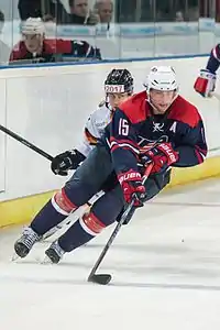 ![]() Smith with the United States men's national hockey team in a game against German's men's national hockey team. | ||