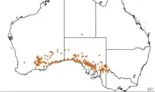 Cratystylus conocephala is found in the IBRA (Interim Biogeographic Regionalisation for Australia) of Coolgardie, Hampton, Mallee (Victoria), Mallee and Nullarbor.[4] on calcerous red soils[6] and sandy soils[5] in Western Australia, South Australia, Northern Territory, New South Wales and Victoria. The species is very rare in the Southern Far Western Plains of New South Wales,[8] and Belah Woodlands of North West Victoria.[5] It is found to grow in mallee, coastal scrub and woodland vegetation communities.[7]