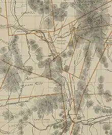 Competition for the tourist trade, which from the outset had been the monopoly of the Crawfords, increased with the greater interest in the area that followed the Willey disaster of 1826.[36] The type of visitor changed, too, and the people who now flocked to the mountains disdained the relatively crude accommodation that the Crawfords could offer.[37] Ethan took out a further mortgage in 1832 to finance a new two-story wing for the Old Moosehorn Tavern, hoping that it would counter the competition now coming from the new White Mountain House hotel.[38] He continued to develop new trails and also tamed some animals to amuse visitors, as well as adding a bowling alley and dance floor,[39] but he became less interested in acting as a guide and often employed people to do that for him. He developed rheumatism and a tumor that caused him constant pain, leading him to attempt unsuccessfully to sell his business in 1835. No-one was prepared to offer a price that would pay his debts but during this time he also befriended Samuel Bemis, a dentist and early photographer from Boston through whom he found a doctor who was able to relieve some of the tumor-related pain.[40]