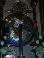 The Cristo Negro of Otatitlán is in the parish church of the town.[17] There are two stories of the origin of this particular image. One states the Spanish king Philip II had the three Black Christ images commissioned, which then went on to their current locations.[18] Another story says that the image was found on the Day of the Cross by an indigenous person at the foot of a tree in the village of Puctlanzingo, which was then claimed by the Mazatecos of the region. Later it was moved on the Papaloapan River on a raft to its current location.[17][18] During the Cristero War in the 1930s, the image was taken by men allied with then governor of Veracruz, Adalberto Tejada, who tried unsuccessfully to burn it. Instead it was decapitated. The headless image returned to Otatitlán and a replacement was made. In 1950, the original head was found and returned, with the replacement head now kept in a glass case.[17][19] The devotion to this image is a syncretism. It is not unusual for there to be a mass followed by a ritual cleansing by a local “brujo” (roughly witch doctor).[17] The major feast day for this image is May 3, Day of the Cross, with events beginnings on April 28 and extending to May 7. The event can attract up to 150,000 people from Veracruz and other parts of Mexico.[18]