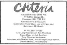 Criteria: A Critical Review of the Arts was a Canadian feminist art periodical published by the Criteria Arts Society in Vancouver, BC from June 1974 until Fall 1978.[1][2]