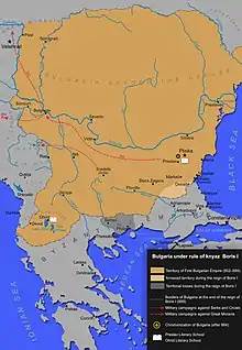 ![]() Bulgaria under rule of knyaz Boris I and 854 campaign against Croatia (middle-left) | |||||||