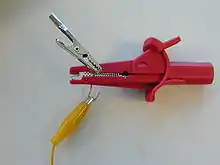 A crocodile clip or alligator clip[1] is a plier-like spring-tensioned metal clip with elongated, serrated jaws that is used for creating a temporary electrical connection. This simple mechanical device gets its name from the resemblance of its serrated jaws to the toothed jaws of a crocodile or alligator. It is used to clamp and grab onto a bare electrical cable to a lead on a battery or some other electrical component. Functioning much like a spring-loaded clothespin, the clip's tapered, serrated jaws are forced together by a spring to grip an object. When manufactured for electronics testing and evaluation, one jaw of the clip is typically permanently crimped or soldered to a wire, or is bent to form the inner tubular contact of a ~4 mm (0.16 in) female banana jack, enabling quick non-permanent connection between a circuit under test and laboratory equipment or to another electrical circuit. The clip is typically covered by a plastic shroud or "boot" to prevent accidental short-circuits.
