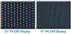Comparison between in-line shadow mask (left) and aperture grille (right) based CRTs