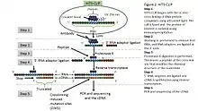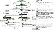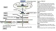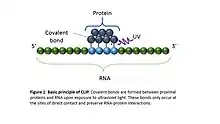 CLIP begins with the in vivo cross-linking of RNA-protein complexes using ultraviolet light (UV). Upon UV exposure, covalent bonds are formed between proteins and nucleic acids that are in close proximity (on the order of Angstroms apart).[5] The cross-linked cells are then lysed, RNA is fragmented, and the protein of interest is isolated via immunoprecipitation. In order to allow for priming of reverse transcription, RNA adapters are ligated to the 3' ends, and RNA fragments are labelled to enable the analysis of the RNA-protein complexes after they have been separated from free RNA using gel electrophoresis and membrane transfer. Proteinase K digestion is then performed in order to remove protein from the crosslinked RNA, which leaves a few amino acids at the crosslink site. This often leads to truncation of cDNAs at the crosslinked nucleotide, which is exploited in variants such as iCLIP to increase the resolution of the method.[6] cDNA is then synthesized via RT-PCR followed by high-throughput sequencing followed by mapping the reads back to the transcriptome and other computational analyses to study the interaction sites.[2]