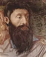 Portraits of donors, political figures, and artists embedded in religious works were common in sixteenth-century Florence. It appears that three of the men surrounding Moses in the right foreground are portraits. Only one has been positively identified. The man with the long dark beard portraying the priest Eleazar is Pierfrancesco Riccio who served as both Cosimo's secretary and a priest at the Florence Cathedral.[21] The man in the red turban is a scholar based on the black coif under the turban, and his Florentine identity is thought to be the writer Pier Francesco Giambullari. The man in blue who is looking out of the fresco at the viewer might be a self-portrait of Bronzino.[22] It has also been posited that the man kneeling in front of Moses in the right foreground is Eleanor's father, Don Pedro de Toledo.[23]