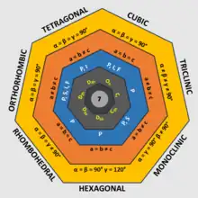 | Crystal family | Lattice system | Volume | Axial distances (edge lengths)[6]: 758 | Axial angles[6] | Corresponding examples |