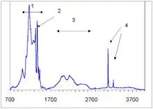 Platelets produce sharp absorption peaks at 1359–1375 and 330 cm−1 in IR absorption spectra; remarkably, the position of the first peak depends on the platelet size.[81][84] As with dislocations, a broad photoluminescence centered at ~1000 nm was associated with platelets by direct observation in an electron microscope. By studying this luminescence, it was deduced that platelets have a "bandgap" of ~1.7 eV.[85]