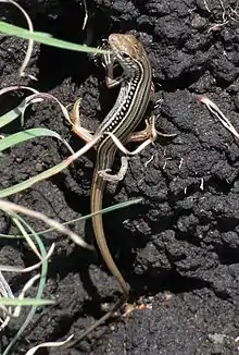 The eastern striped skink (Ctenotus robustus) is a species of skink found in a wide variety of habitats around Australia.[3] They are long-tailed, fast moving skinks that are quite large, growing to a maximum length of about 30 cm (including the tail which can make up around 2/3 of its length).[3][4] This skink is mostly brown with a white-edged black stripe running down the length of its back and tail with broad brown stripes along the side of the body with rows of white spots.[3] The sides become lighter, turning into an off-white colour towards the underside of the skink, running from the groin to the chin.[4] The striped skink (Ctenotus robustus) is similar in appearance to the spotted-back skink (Ctenotus uber orientalis) with the main identifying difference being the solid stripe running down the back of C. robustus whereas C. uber orientalis has a row of dots.[4]