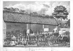 The palace complex was located in the eastern quarter of the central city and it covered some 5 acres.[35] The complex was secluded by a high wall, first described by Bowdich in the early 19th century.[35][36][37] Certain palace courtyards could contain up to 300 people.[37] Bowdich mentioned the "King's garden" as a part of the palace complex in 1817, which was "an area equal to one of the large squares in London."[37][38] Included in this garden were 4 large parasols and a dinner table which were used for state banquets.[37] A passage way lined with offices and living rooms of the officials served as the access point to the palace. It was referred to as a piazza by Bowdich and he estimated its length to be 200 yards long. He also added that it "lines the interior of the wall secluding the palace from the street."[35]