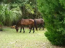 Horses are not native to Cumberland Island. Popular myth states they were brought to the island by the Spanish in the 16th century.[1][2] However, it is believed that these first horses more than likely did not survive due to the lack of visits made by the Spanish and the local Native Americans on the island finding them of little practical use.[1] In the 18th century, the English began settling Cumberland Island. The horses seen there today are most likely descendants of horses brought by these settlers, as this is when a large majority of the horses began to roam freely and revert to their natural state, becoming feral. During the 19th century, efforts were made to capture and make use of the horses. The first attempts were made by the island plantation owner Robert Stafford, who allowed visitors to purchase and capture the horses, which Stafford called "marsh tackies," for their own personal use.[1] The horses were next used as cavalry animals during the American Civil War. After the war, records suggest that people from Jekyll Island captured some of the horses for horse meat.[1] Around 1881, Thomas M. Carnegie bought two plantations on the island and introduced Tennessee Walking Horses, Paso Finos, and Arabians into the feral horse population in an attempt to improve the animals. Carnegie received a small amount of income from the buying and selling of these animals. Later, many island residents began introducing additional breeds into the herds on the island, further diversifying the bands of horses. In 1921, a large number of horses were brought onto the island from Globe, Arizona, all of which had been running wild on western rangeland.[1]