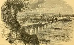 A second crossing in a slightly different location began construction on February 3, 1845, and was completed in 1846. This bridge had an upper deck for railroad traffic, and a lower deck for pedestrian and wagon traffic. Use of the lower deck was discontinued when the bridge was strengthened in 1850.[1] The bridge's latticework timbers were removed and replaced with heavier braces from 1855 to 1856, and new wooden arches were built in 1872.[1] From 1880 to 1886, the piers beneath the bridge were gradually replaced, allowing it to carry much heavier traffic.[1]