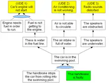 • attempting to link any two UDEs using cause-and-effect reasoning. For example, "if the engine needs fuel in order to run and fuel is not getting to the engine, then the car's engine will not start."