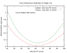 In the 1960s in the Soviet Union curve resistance was found by experiment[7][8] to be highly dependent on both the velocity and the banking of the curve, also known as superelevation or cant, as can be seen in the graph above. If a train car rounds a curve at balancing speed such that the component of centrifugal force in the lateral direction (towards the outside of the curve and parallel with the plane of the track) is equal to the component of gravitational force in the opposite direction there is very little curve resistance. At such balancing speed there is zero cant deficiency and results in a frictionless banked turn. But deviate from this speed (either higher or lower) and the curve resistance increases due to the unbalance in forces which tends to pull the vehicle sideways (and would be felt by a passenger in a passenger train[9]). Note that for empty rail cars (low wheel loads) the specific curve resistance is higher, similar to the phenomena of higher rolling resistance for empty cars on a straight track.