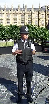 The custodian helmet is a type of helmet worn predominantly by male police officers in the United Kingdom, within England and Wales, and certain other places around the world.[1] First used by the Metropolitan Police in London in 1863, the BBC labelled the custodian helmet a "symbol of British law enforcement".[2] They are worn by male constables and sergeants on foot patrol.[3] A cultural icon, it has featured in films, TV series and other media involving British police.[2]