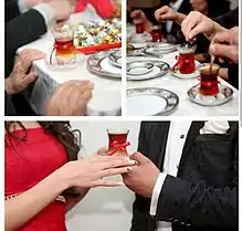 Tea is served in any ceremony in Azerbaijan regardless of whether it is a funeral or a wedding. Whether tea is sweet or sugarless shows the decision or at least the opinion of parents of girls about the marriage on the matchmaking process. Sugar is the key indicator of their agreement.[3][4][5]
