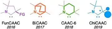Since 2005, the family of cyclic (alkyl)(amino)carbenes expended to encompass the functionalized FunCAACs,[5] the BiCAACs with a bicyclic backbone,[6] the CAAC-6s with a 6-membered backbone,[7] and the chiral ChiCAACs used in asymmetric catalysis.[8]