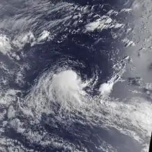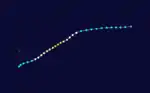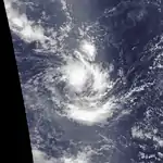 While Honorinina was intensifying and moving toward Madagascar, another system was forming on March 13 south-southeast of Diego Garcia.[31] At 06:00 UTC that day, a tropical storm formed,[32] although it was not named Iarima until the next day.[31] Also on March 13, the JTWC began classifying the storm as Tropical Cyclone 26S.[2] Iarima initially moved southwestward, failing to intensify beyond winds of 65 km/h (40 mph).[32] On March 15, the storm turned and accelerated to the southeast after an anticyclone formed between Iarima and Honorinina. It subsequently weakened, dissipating on March 18 while approaching 90° E.[31][32]