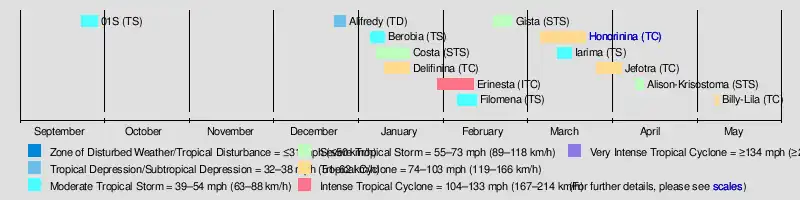 The 1985–86 South-West Indian Ocean cyclone season was the first in which the Météo-France office (MFR) on Réunion tracked cyclones as far east as 90° E in Indian Ocean, south of the equator. Previously, the agency's area of responsibility was limited to 80° E. It was an active season with twelve named storms, of which five strengthened into tropical cyclone with 10 minute sustained winds of at least 120 km/h (75 mph).[nb 1] The first named storm was Tropical Storm Alifredy, which originated in the Mozambique Channel in late December and moved across Madagascar. However, the unofficial Joint Typhoon Warning Center (JTWC) tracked a short-lived storm in September.