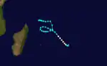 On December 23, a tropical depression formed in the Mozambique Channel, accompanied by spiral rainbands toward the center.[7] That day, the system reached peak winds of 65 km/h (40 mph),[8] and the Madagascar Meteorological Service named it Alifredy. The storm moved quickly southeastward toward Madagascar. High pressures to the south prevented much development, and Alifredy moved ashore near Morondava in western Madagascar on December 24 at peak intensity. While crossing the island, the storm weakened into a tropical depression. Alifredy emerged into the open Indian Ocean and failed to restrengthen. It became extratropical and turned southeastward, dissipating on December 27 within the westerlies.[7][8] The JTWC did not track the storm.[2] Alifredy had little impacts on Madagascar; Morombe reported a peak wind gust of 56 km/h (35 mph).[7]