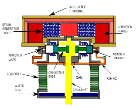 The piston assembly is an even number of pistons arranged radially around a single crankshaft. The pistons are attached to the crankshaft via a special "spider" bearing. This bearing consists of several small journal bearings attached to a disk which has a larger crankshaft journal bearing in the center. Each piston has one head admission valve. This valve is actuated by a variable cam on the crankshaft, and allows for the entrance of supercritical water into the cylinder. As the supercritical water enters the cylinder it flashes into steam and pushes the piston inward, thus rotating the crankshaft.