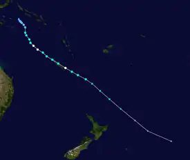 Upon moving into the South Pacific region, westerly wind shear began to inhibit further intensification, as the influence of a trough passing to the south of Ruby increased.[1] This made the system weaken slightly, with the combination of a mid-level dry air entrainment.[12] At 17:00 UTC (04:00 NCT the next day), Ruby made landfall in Belep, New Caledonia, before moving over Poum an hour later.[13] The JTWC subsequently downgraded Ruby into a tropical storm late on the same day.[14] As the storm emerged from New Caledonia at 06:00 UTC (17:00 NCT) on 14 December,[13] the storm encountered a marginally favorable environment, with high wind shear, cool sea surface temperatures, and dry air entrainment offset by strong poleward outflow.[15] With its deep convection quickly reducing,[1] and the storm's center continuing to elongate,[16] the FMS downgraded Ruby to a Category 1 tropical cyclone 12 hours later.[17] The JTWC issued its final advisory on the storm three hours later, as the storm was already undergoing subtropical transition.[18] The FMS passed the responsibility of warning Ruby to the New Zealand MetService the next day, as it left its area of responsibility towards the south-east.[19] By 06:00 that same day, the MetService reported that Ruby had slightly restrengthened,[20] before reclassifying it as an extratropical cyclone twelve hours later.[21]