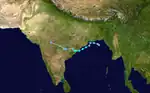 An area of convection formed on October 1 southeast of India. It was located in an area of moderate wind shear. The system moved to the northeast, developing more convection over the circulation. On October 2, the JTWC classified it as Tropical Cyclone 03B, although the IMD never issued warnings on the system. The JTWC estimated peak 1 minute winds of 65 km/h (40 mph). Early on October 3, the storm moved ashore just south of Kolkata, and dissipated soon after.[14] Heavy rains swamped portions of northern Bangladesh causing tremendous flooding that destroyed more than 100,000 mud-built homes. Government officials estimated that 1.5 million people were rendered homeless. Floods also damaged 200,000 hectares (500,000 acres) of crops and 1,000 km (620 mi) of roads. At least 16 people were killed while waterborne diseases in the aftermath threatened to kill dozens more.[26][27][28]