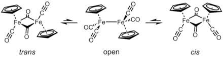 In solution, Cp2Fe2(CO)4 can be considered a dimeric half-sandwich complex. It exists in three isomeric forms: cis, trans, and an unbridged, open form. These isomeric forms are distinguished by the position of the ligands. The cis and trans isomers differ in the relative position of C5H5 (Cp) ligands. The cis and trans isomers have the formulation [(η5-C5H5)Fe(CO)(μ-CO)]2, that is, two CO ligands are terminal whereas the other two CO ligands bridge between the iron atoms. The cis and trans isomers interconvert via the open isomer, which has no bridging ligands between iron atoms. Instead, it is formulated as (η5-C5H5)(OC)2Fe−Fe(CO)2(η5-C5H5) — the metals are held together by an iron–iron bond. At equilibrium, the cis and trans isomers are predominant.