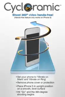 Cycloramic is an iOS and Windows Phone application that makes the Apple iPhone and Compatible Windows Phones rotate 360 degrees without user intervention. It switches the phone's vibrator at a specific (undisclosed) frequency to make the phone spin around its vertical axis and track the rotation angle using the gyroscope, compass and accelerometer while taking panoramic images. This "handsfree" feature works only on the iPhone 5 and iPhone 5s standing on one of its flat edges. Because of this limitation, iPhone 4 users take panoramic photos in a guided mode. Another feature of this program is the ability to post process panoramic images into 24-second videos for other uses. The update introduced on June 22, 2013 added features to store, edit and share the panoramic pictures.