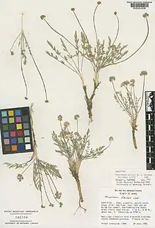 Cymopterus davisii is a species of flowering plant in the carrot family known by the common name Davis's springparsley. This small, flat, taprooted perennial is endemic to Idaho in the United States, where it occurs in the Albion Mountains.[1][2] The plant is found in the Albion Division of the Minidoka Ranger District of Sawtooth National Forest. It reaches approximately 7 in (18 cm) in height with a short stem that is sheathed by fibrous leaf bases. Numerous leaves form a whorl around yellow-flowered umbels.