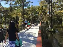 Cypress Lake is a 2-acre (0.8 ha) swamp-like lake in the heart of the University of Louisiana at Lafayette campus that started as a prehistoric bison wallow. Today it is a unique university landmark that is a habitat for native irises, alligators, turtles, birds and fish, as well as a hangout for students and a point of interest for tourists visiting Lafayette, Louisiana. Cypress Lake is casually called "The Swamp," which is also the nickname of the Louisiana Ragin' Cajuns football stadium, officially named Cajun Field.