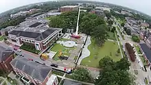 Overhead view of Cypress Lake, illustrating its natural makeup within an urban setting. Cypress Lake Plaza (under construction at the time of this photo) is located in the bottom of the picture, with the Student Union to the left, and wrapping around the lake