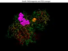 Crystal structure of gcoB (cartoon diagram) complexed with FAD (magenta spheres) and an iron–sulfur cluster (orange/yellow) based on PDB: 5OGX.[1]