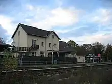 Elsdorf (Rhld)—short for Rhineland—station (meaning at line-kilometre 14.9 of the Düren–Neuss line was referred to in the timetables of the 1970s as Elsdorf (Rhld) West, as the town had another station, Elsdorf (Rhld) Ost (east), from which passenger trains ran to Bergheim (Erft) until 1961 and freight trains until 1967. In the 1980s, the entrance building of Elsdorf (West) was demolished together with signal box “Ent” on Köln-Aachener Straße and was replaced by a small shelter. From 27 May 1995 the passenger traffic was discontinued in the Düren–Bedburg section, on 31 December of the same year, the freight traffic. The line was closed permanently on 2 June 1996. The Düren–Elsdorf section was in the area of today's Hambach lignite mine and was therefore dredged. The Elsdorf–Bedburg section was initially still used for freight, bit it later closed due to lack of demand and dismantled. The site of the station is now a parking area. The former route through Elsdorf is now dismantled and will in future be converted into a park for cyclists and walkers. Part of the line became the property of the Elsdorf sugar factory.