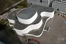 The present theatre was commissioned by the city of Düsseldorf during the tenure of Stroux.[1] The Operettenhaus, which had served as a venue for performance of plays after World War II, proved too limited. In 1957 a new building was proposed, for which the site, on Gustaf-Gründgens-Platz, was secured in 1958. An international competition was held in 1959 and won by Pfau. The theatre is designed like a sculpture, juxtaposed to the nearby Dreischeibenhaus. The style has been described as organic architecture. The great hall (Großes Haus) seated 900 people then (now 760), the small hall (Kleines Haus) 300.[2]