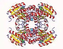Only one structure has been solved for this enzyme, under the Protein Data Bank accession code 1ZEM.[5] The enzyme has 262 amino acid residues and is a tetramer. Each monomer has a Rossman fold domain made up of seven β sheets side by side with three short α helices on one end of the sheet and three longer α helices on the other. There are two shorter helices that stay outside of this Rossman fold.
