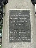 Don Stephen Senanayake (Sinhala: දොන් ස්ටීවන් සේනානායක; Tamil: டி. எஸ். சேனநாயக்கா; 20 October 1884 – 22 March 1952) was a Ceylonese statesman. He was the first Prime Minister of Ceylon having emerged as the leader of the Sri Lankan independence movement that led to the establishment of self-rule in Ceylon. He is considered as the "Father of the Nation".[3]