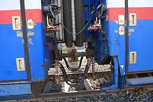 The locomotive has two sets of bogies, each with two axles in the Bo-Bo layout.[14] As the locomotive is based on the basic structure of the SS8, the bogies are also largely similar. The bogies use Low Alloy High Tensile steel. The suspension between the wheels and the bogie frame are soil springs with vertical dampers; the suspension between the bogie and the locomotive are flexible coil springs with vertical, yaw and horizontal damping. The wheels are driven by six elastic shafts connecting the frame supported motor, driven with a gearbox on each side.[1]