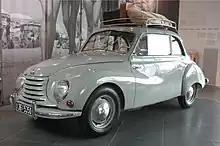 The DKW 3=6 is a compact front-wheel drive saloon manufactured by Auto Union GmbH.[2] The car was launched at the Frankfurt Motor Show in March 1953 and sold until 1959. It carried the name Sonderklasse ("Special Class") on the right hand fender of all steel bodied models – this being part of the model name for this range. The first model in the range was named by factory project number, DKW F91, which was replaced by the F93 and F94 models from the 1956 model year[2]. The F93 and F94 models were referred to by Auto Union as the "Big DKW 3=6" (Großer 3=6).[2] From 1958, by which year the car's successor, the Auto Union 1000 Coupe de Luxe, was already being sold and the earlier version had therefore become, in essence, a ‘run-out’ model, it was known more simply (in the USA and the Netherlands only) as the DKW 900.[3]