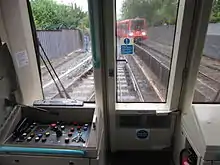 View from the front of a Docklands Light Railway train. The control desk is usually closed and locked.