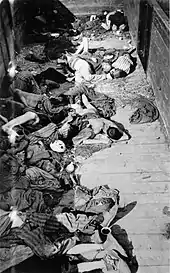During the Dachau liberation reprisals,[Note 2] German SS troops were killed by U.S. soldiers and concentration camp prisoners at the Dachau concentration camp on April 29, 1945, during World War II. It is unclear how many SS guards were killed in the incident, but most estimates place the number killed at around 35–50. In the days before the camp's liberation, SS guards at the camp had forced 7,000 inmates on a death march that resulted in the death of many from exposure and shooting.[1] When Allied soldiers liberated Dachau, they were variously shocked, horrified, disturbed, and angered at finding the massed corpses of prisoners, and by the combativeness of some of the remaining guards who allegedly fired on them.