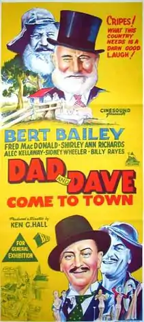 Dad and Dave Come to Town is a 1938 Australian comedy film directed by Ken G. Hall, the third in the 'Dad and Dave' comedy series starring Bert Bailey. It was the feature film debut of Peter Finch and is one of the best known Australian films of the 1930s.[5]